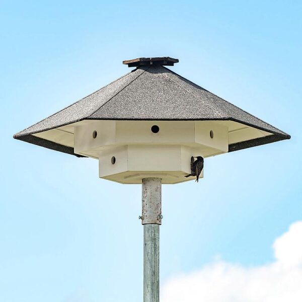 Cette tour offre à l’étourneau sansonnet, à la mésange et au moineau friquet un lieu de nidification de substitution avant, pendant et après des travaux de rénovation ou de construction. Fabriquée en bois de pin nordique, cette tour se compose de 9 compartiments individuels.