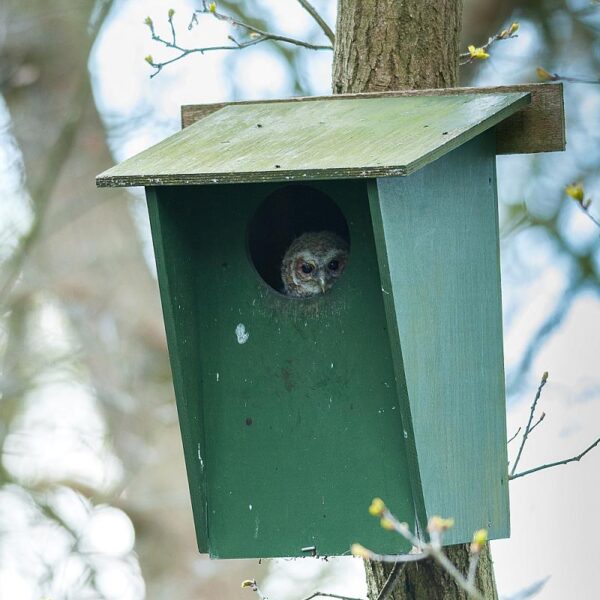 De nestkast wordt ook graag bewoond door holenduiven en kauwen. Als de bosuil de kast wil gebruiken zal hij eventuele andere gebruikers verjagen.
