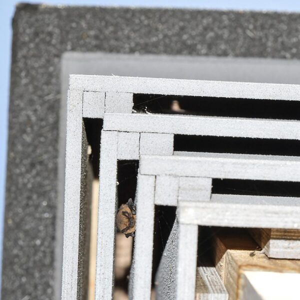 De paalkast bestaat uit drie compartimenten die op alle windrichtingen zijn georiënteerd. De tussenruimten van 19 mm zijn aan de binnenzijde afgewerkt met spuitkurk voor extra grip, en via openingen in de tussenwanden kunnen vleermuizen zich eenvoudig tussen de compartimenten verplaatsen. Aan de onderzijde bevindt zich een open lamellenstructuur, waardoor vleermuizen gemakkelijk naar binnen kunnen kruipen. Daarnaast zorgen ventilatiespleten aan twee zijden voor een goed binnenklimaat.
