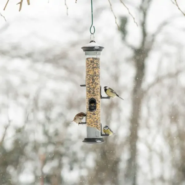 Deze voedersilo is ontworpen om tuinvogels op een comfortabele en veilige manier te voeren. Onderzijde, deksel en poortjes kunnen gemakkelijk losgemaakt worden met het Click & Go-systeem, zonder gereedschap. Dit maakt schoonmaken, demonteren en vullen eenvoudig.